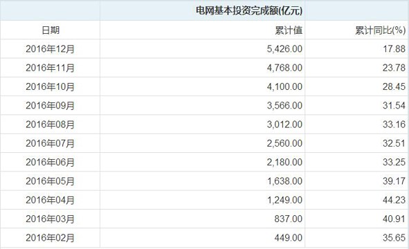 電網建設是我國能源轉型的基礎,周期長,規模大,難度高,為了盡快實現這個目標,近幾年我國在電網建設上逐步加大投資,石家莊電纜為大家統計出了較精確的數據:我國2016年的電網投資約5426億元人民幣,同比增長17.88%。